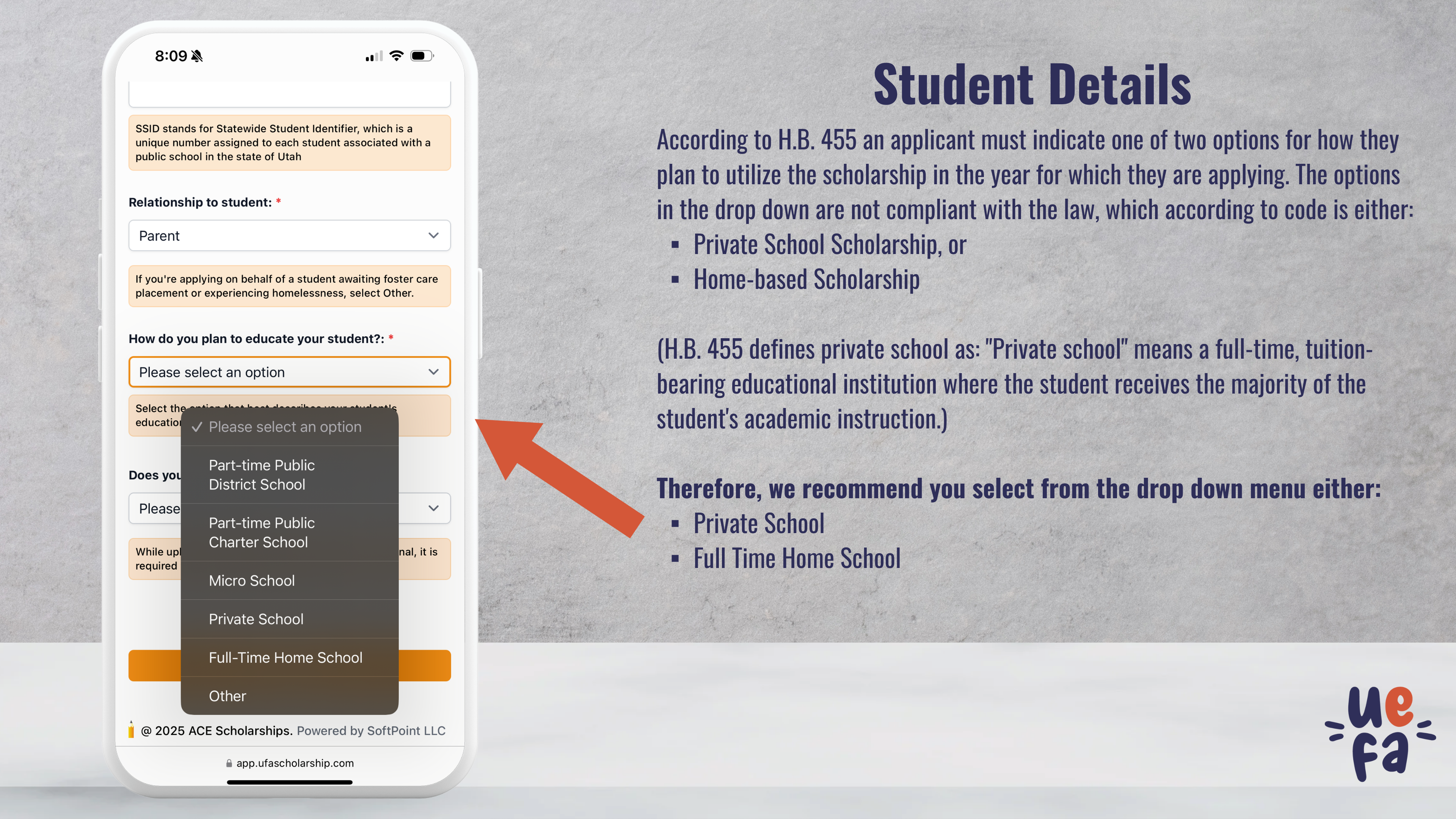 1. Select how you plan to use the scholarship from one of two options: Scholarship amounts will be determined based on your selection. There are currently six options presented. Only two are valid and in alignment with the law.